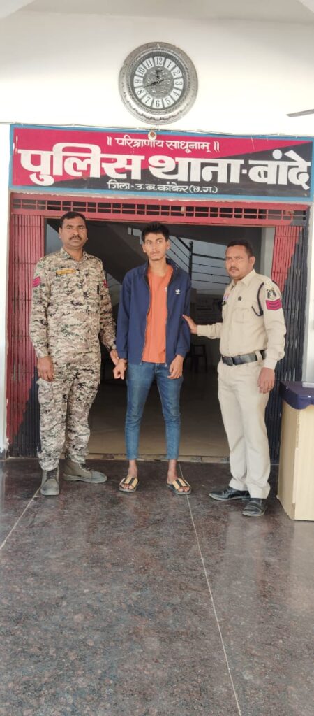 थाना बांदे जिला-कांकेर पुलिस की त्वरित कार्यवाही पुलिस अधीक्षक महोदय कांकेर निखिल अशोक कुमार रखेचा के निर्देश श्रीमान अतिरिक्त पुलिस अधीक्षक पखांजूर राकेश कुमार कुर्रे के मार्गदर्शन पर पुलिस अनुविभागीय अधिकारी पखांजूर रवि कुमार कुजूर के पर्यवेक्षण में थाना बाँदे के अप क्रमांक 04/26, धाराः-137 (2), 87 बीएनएस के आरोपी कैलाश मण्डल पिता निरंजन मण्डल 20 वर्ष निवासी पीव्ही 88 रघुनाथपुर थाना बांदे जिला उ०ब० कांकेर (छ0ग0) को तत्काल थाना लाया गया। प्रकरण के प्रार्थी प्रधान वैध ने बताया कि दिनांक 07.01.2026 के में करीबन 09.30 बजे कैलाश मण्डल अपने मोटर सायकल में मेरे नाबालिक लड़की को भानुप्रतापपुर ले गये और रास्ते में दुर्दूकोंदल मंदिर में नाबालिक बालिक कैलाश मण्डल ने मैं तुमसे प्यार करता हूँ शादी करके अपने पत्नि बनाकर रखूंगा बोलकर जबरदस्ती सिंदूर लगाकर अपने साथ भानुप्रतापपुर रेल्वे स्टेशन लेकर गये और दिनांक 08.01.2026 को भानुप्रतापपुर से ट्रेन बैठाकर दुर्ग लेकर गये दुर्ग से दिल्ली ले गया था दिनांक 14-1-2026 को दिल्ली से अपने घर वापस आकर नाबालिक लड़की को रखा हैं की रिपोर्ट पर 15.01.26 को अपराध पंजीबध्द कर आरोपी का पता तलाश किया गया। आरोपी कैलाश को दिनांक 16.01.2026 को पकड़ कर पुछताछ करने पर आरोपी के द्वारा अपराध स्वीकार पर गिरफ्तार कर न्यायिक रिमांड पर माननीय न्यायालय पखांजूर पेश किया गया है। न्यायालय के आदेशानुसार आरोपी को जिला जेल कांकेर दाखिल किया गया।